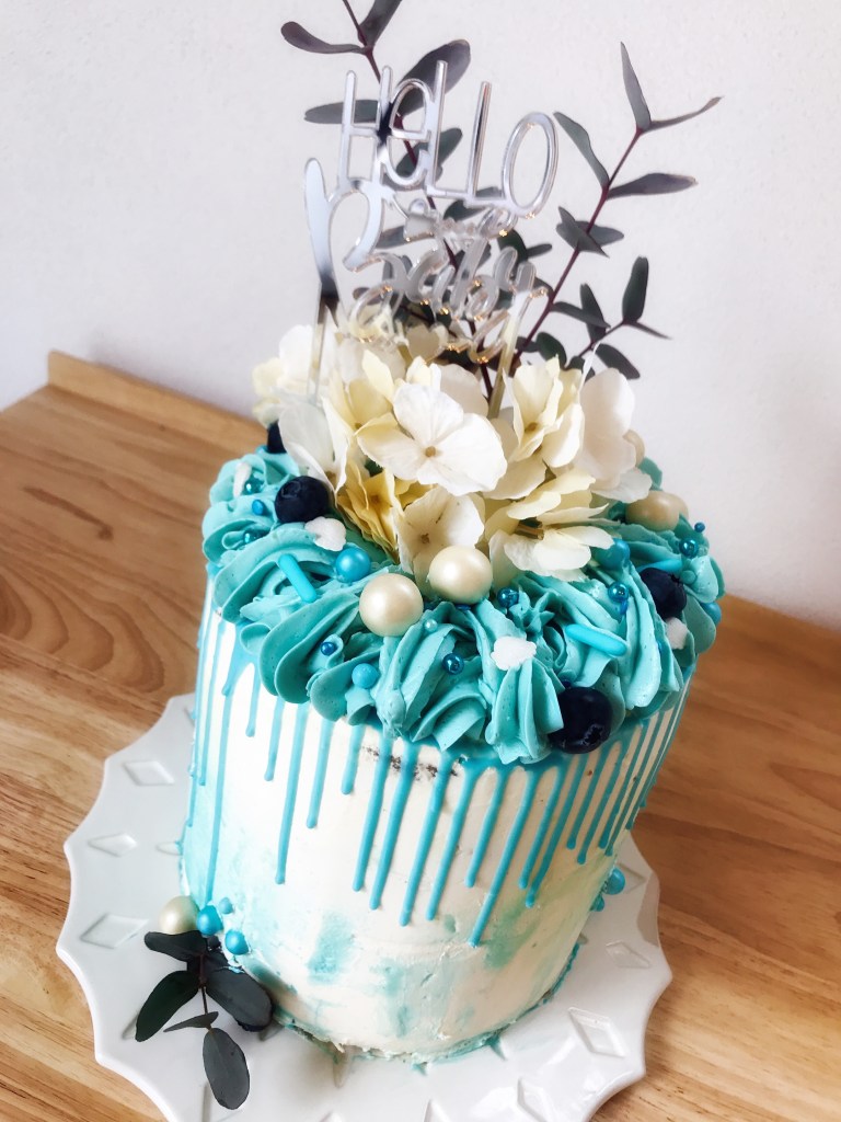 Nimm nun deine(n) Boden zur Hand. Eine 20cm Boden zwei mal, wenn du zwei 15cm Böden hast jeweils einmal durchschneiden. Jetzt kann deine Torte zusammengebaut werden. Dazu einen Klecks Buttercreme mittig auf dein Cardboard oder Tortenplatte spritzen und einen Boden darauf setzen. Den Tortenring darum schließen. Mit der Buttercreme den Boden dünn bestreichen und einen ca. 2cm hohen Kranz am Rand entlang spritzen. Ein Drittel bzw. zwei Drittel des Heidelbeerkompotts darauf verteilen. Diese nun mit einem bzw. zwei Dritteln der Sahne-Quarkcreme bedecken. Wieder einen Boden darauf setzen und den Vorgang wiederholen, bis du mit einem Tortenboden abschließt. Einen Holzspieß auf die Höhe der Torte kürzen und mittig zur Stabilisierung einstecken. Nun alles für mindestens 1 Stunde in den Kühlschrank. So wird die Buttercreme fest und gibt dir die nötige Stabilität beim Einstreichen. Nach der Kühlzeit den Tortenring entfernen und die Torte großzügig mit Buttercreme einstreichen und Glattstreichen. Einen Rest der Buttercreme mit blauer Lebensmittelfarbe einfärben. Torte mit den verschiedenen Dekoelementen nach Wunsch verzieren.