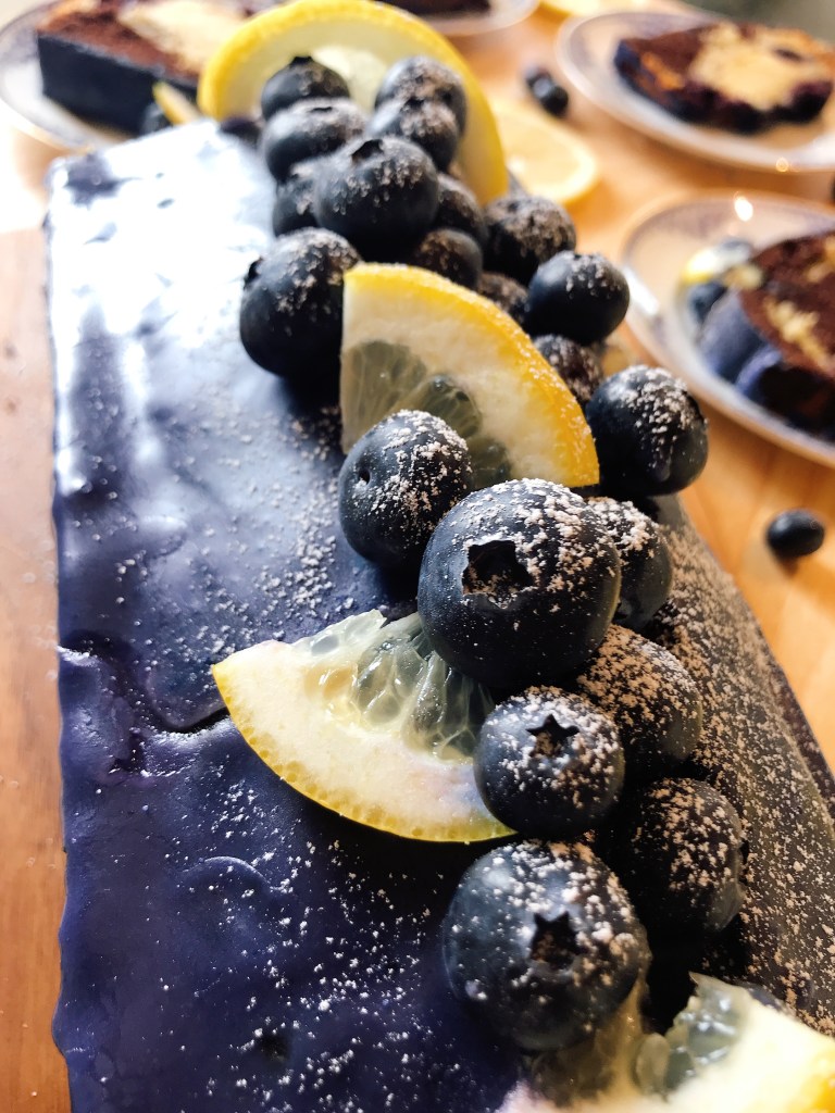 Den Kuchen danach gut auskühlen lassen, dann geht er besser aus der Form. Den Zuckerguss aus dem Puderzucker und Fruchtsaft anrühren, nach Wunsch noch mit blauer Lebensmittelfarbe einfärben. Den Kuchen mit dem Guss übergießen und nach Lust und Laune mit Blaubeeren und Zitronen dekorieren.