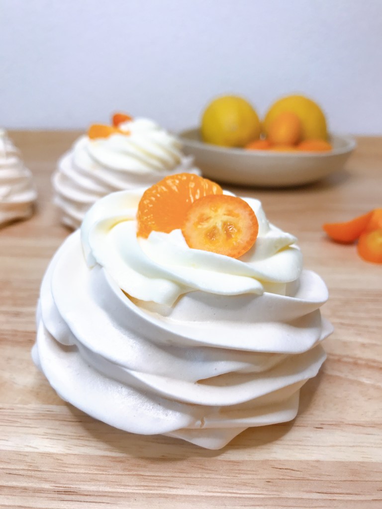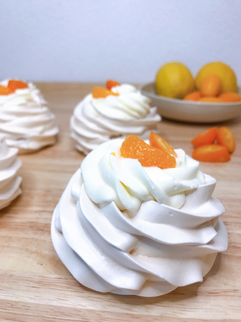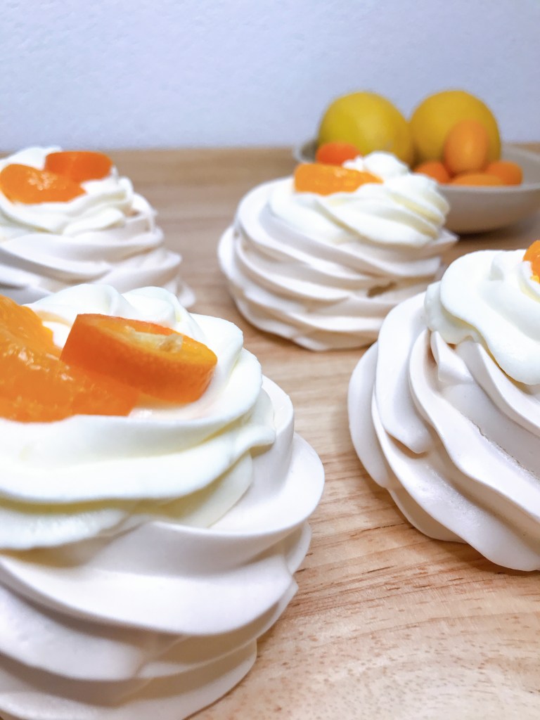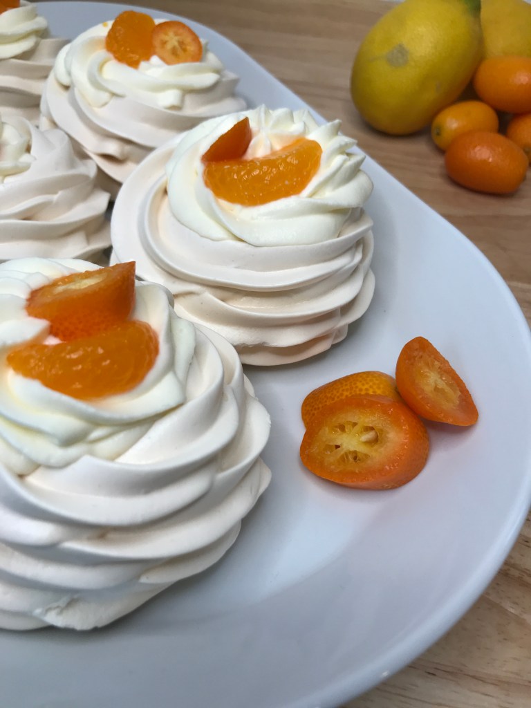 Nachdem die Pavlovas erkaltet sind, diese mit der Creme befüllen und mit Obst dekorieren. Ich habe Kumquats und Dosenmandarinen gewählt.