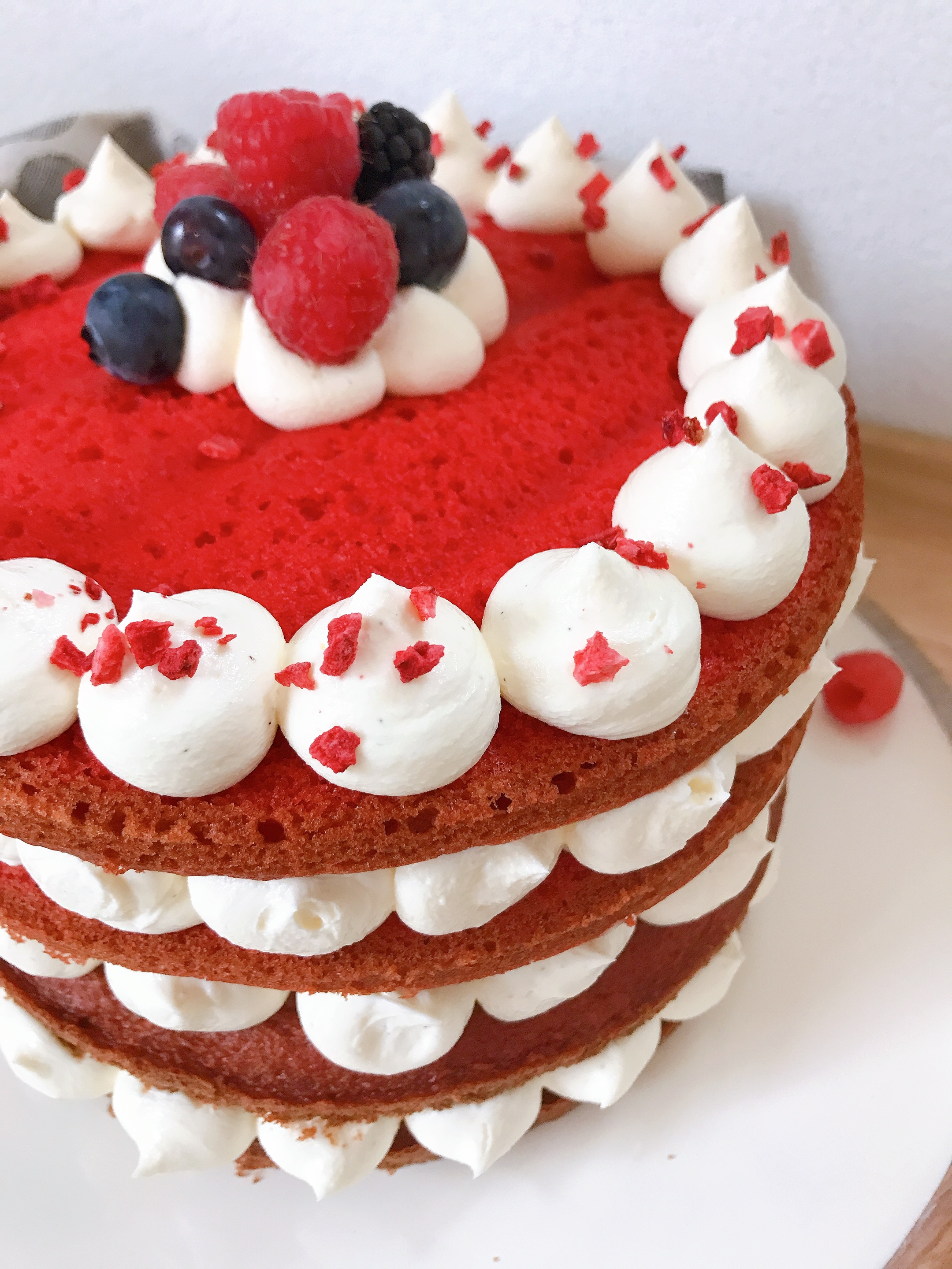 Für die Füllung alle Zutaten glatt rühren. Vermeide es jedoch, zu lange zu rühren, da der Frischkäse sonst zu flüssig wird. Dann alles in einen Spritzbeutel mit Lochtülle geben und abwechselnd mit den Böden aufspritzen. Für die Symmetrie habe ich die unteren beiden Böden mit der glatten Seite nach unten, die oberen Böden mit der glatten Seite nach oben positioniert.