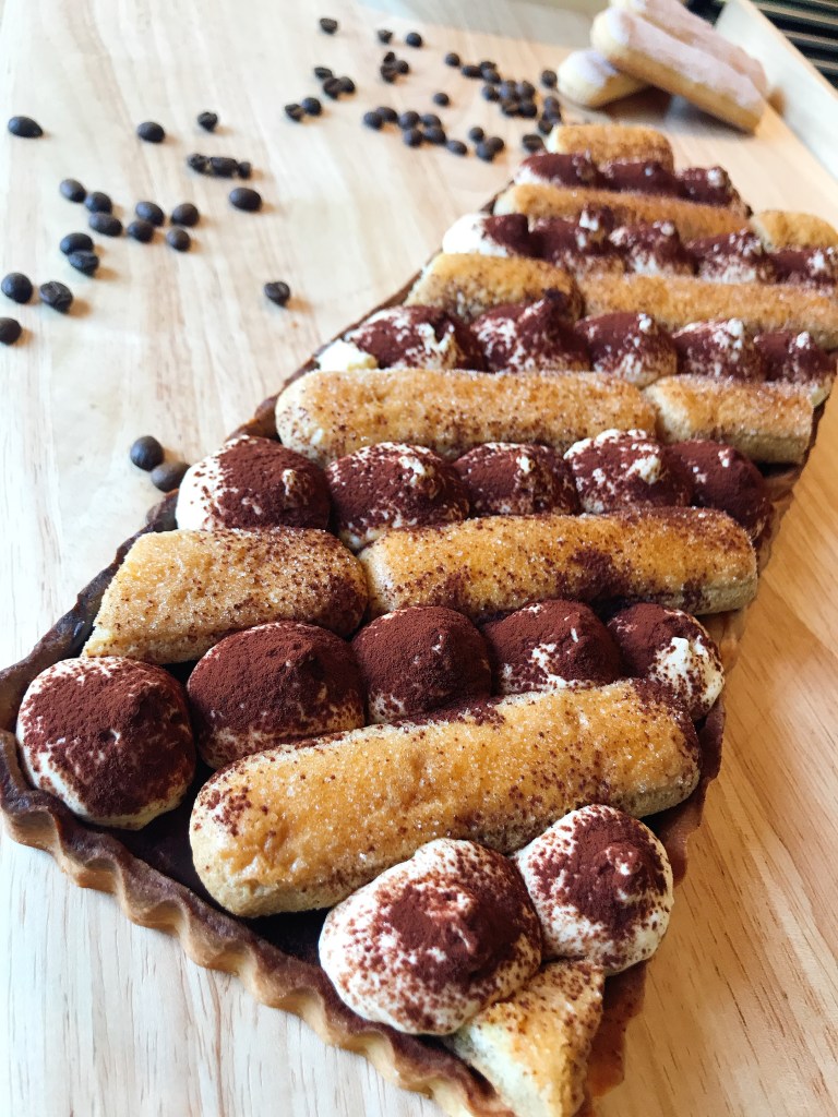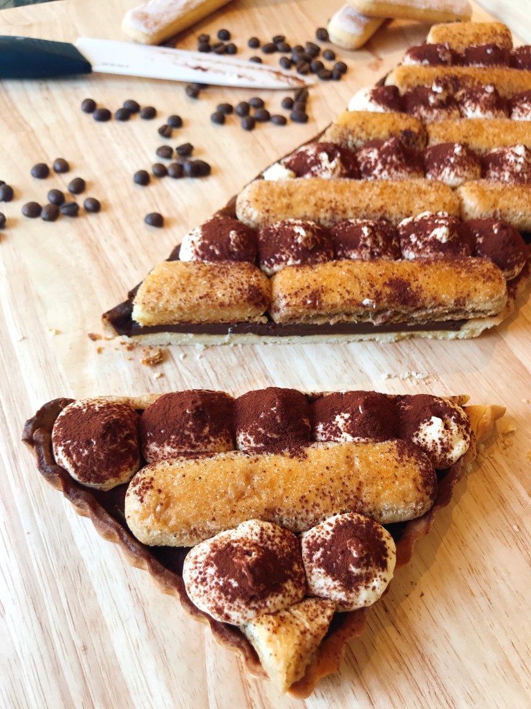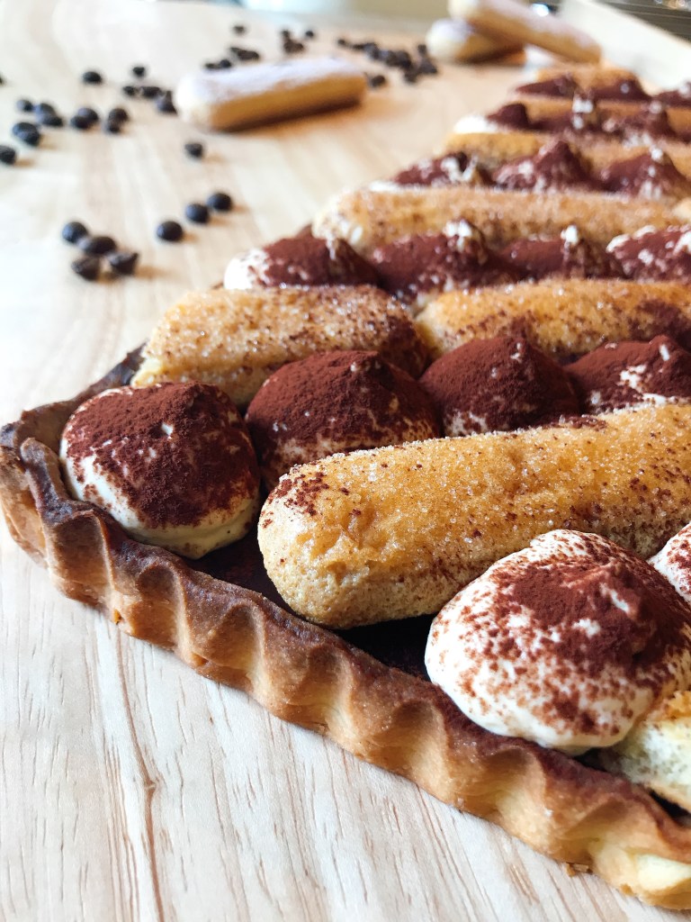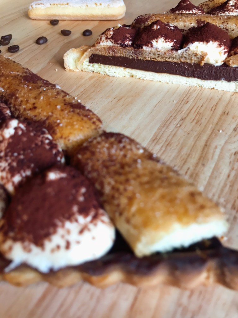 Eine Kombination aus Tarte und Nachtisch? Tadaaa! Diese herrliche Tarte verbindet eine Füllung aus Zartbitterschokolade mit leckeren in Kaffee getränkten Löffelbiskuits und fluffiger Mascarponecreme. Das alles auf einem Mürbeteig und bestäubt mit dunklem Kakaopulver. Ein italienisch-französisches Träumchen. Grenzübergreifendes Backen sozusagen!