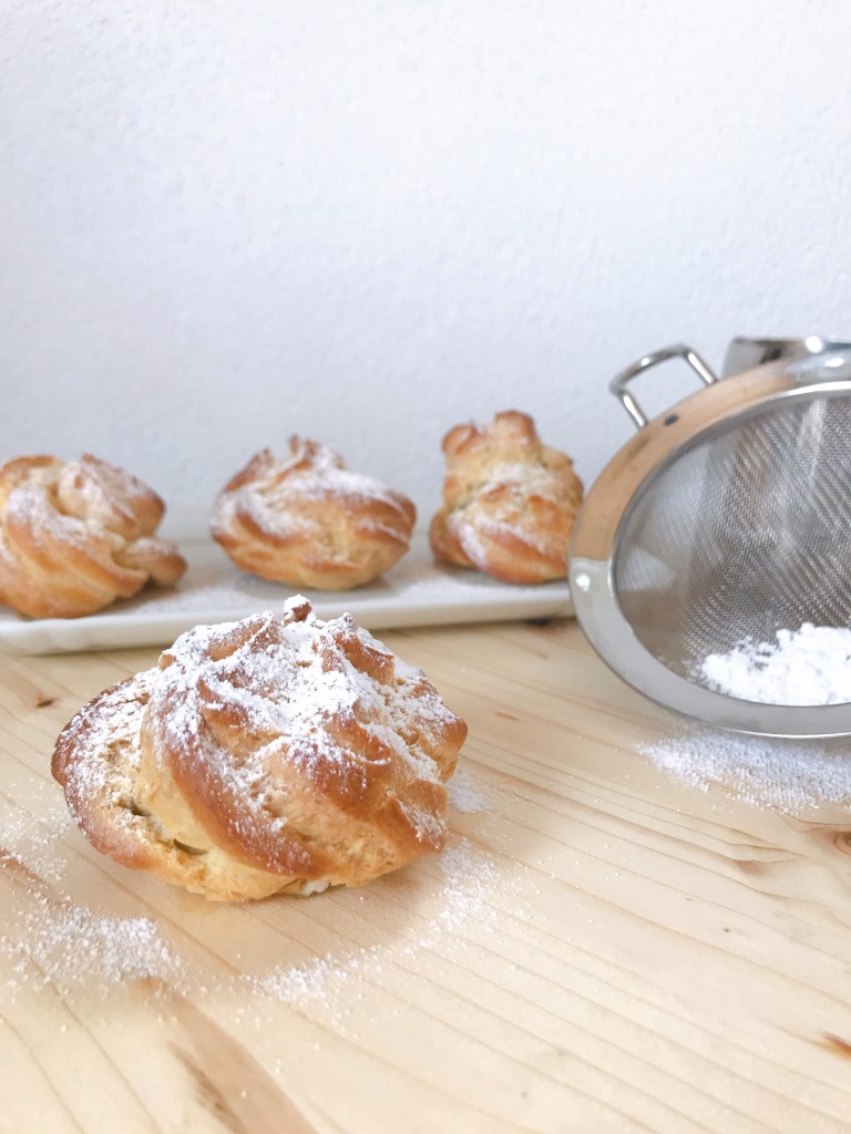 … oder wie ich sie gerne nenne: Le petits choux! Weil, sind wir doch einmal ehrlich, es hört sich gleich nach großer Patisserie Kunst an, wenn man es auf französisch sagt. Im Grunde ist es aber nur ein Brandteig, bei der Füllung kannst Du natürlich variieren. Diese sind, jahreszeitentypisch mit Rhabarber- kompott und Sahne gefüllt. Mit was würdest Du Deine am liebsten füllen?